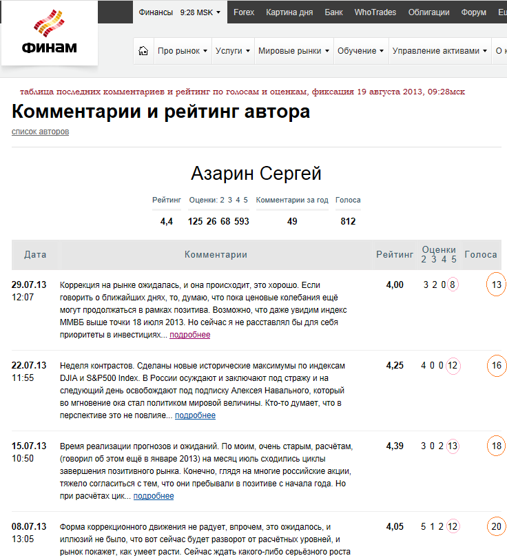 На первой таблице можно увидеть, что Сергея Азарина, как аналитика, посетители сайта FINam.ru оценили достаточно высоко, что позволило занять 2 место из 247 возможных.