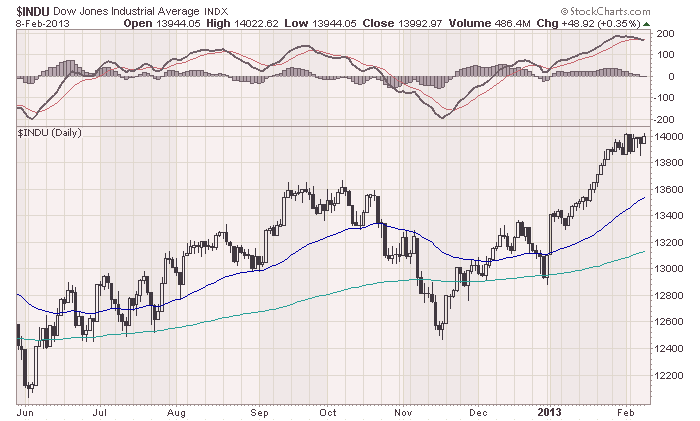 Сейчас вообще время уникальное. Оптимизм американского фондового рынка другие региональные биржи вдохновляет, а какие-то рынки остаются за бортом. В чём уникальность? Американские биржевые индексы подходят к своим историческим максимумам. Если брать цены закрытия 25 января 2013, то индекс Dow Jones Industrial Average закрылся -2.13% от исторического максимума, достигнутого 11 октября 2007 при 14198.10 pts. Индекс S&P500 закрылся -4.64% от максимума, достигнутого 11 октября 2007 при 1576.09 pts.
