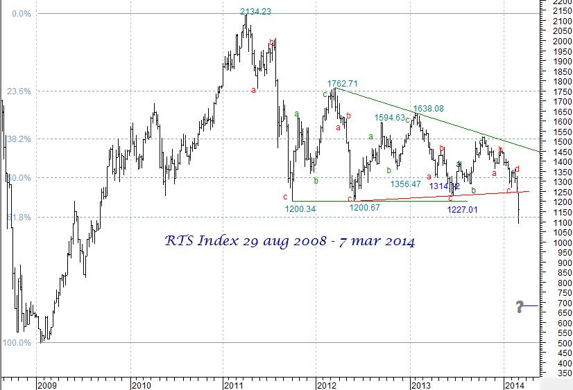 Ну а если отвлечься от общего фона и смотреть только на технику и графику, что получается? Как говорил в прошлый раз, будет два варианта: лёгкий и тяжёлый. Лёгкий - это сброс индекса ртс в сектор 1150-1200, индекса ммвб на 1320, что может знаменовать собой последний штрих перед крупным масштабным разворотом к долгому росту. Тяжёлый сценарий - сброс на эти уровни лишь на некоторое время затормозит движение вниз, которое возобновится более мощным падением. Лёгкий вариант рассматривать сейчас не интересно, о нём было сказано уже много. А тяжёлый ("четвёртый вариант") имеет смысл. Примерная цель падения - около 650 пунктов, это если следовать графической теории пробоя треугольников, где цель движения считается по основанию. Если делать расклад по волнам Эллиотта, то долгосрочная цель падения около 550-600 пунктов, ну а рубледоллар - в район 42-44. Вот такие последствия...