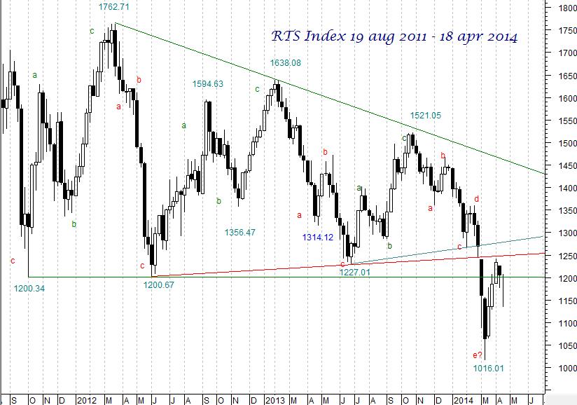 Второй вариант - это отмена пятиволнового импульса, уход ниже 1450 и дальше, либо до уровня 1360-1370, либо 1320-1330 пунктов. В этом случае мы получаем то, что было на индексе ртс. А именно, недельную тройку a-b-c. На это намекают некоторые бумаги, которые могут развить небольшой импульс вниз, прикинул по процентам, это около -12%, как раз получается около 1320 пунктов от текущего ценника. Если учитывать, что рынки связаны, то и индекс ммвб может пережить коррекционный импульс "с". Ну а индекс ртс тогда уйдёт куда-то в сектор 1150-1200 пунктов. По ртс мы получим импульс a-b-c-d-e, как правило такие импульсы могут появляться в конце затяжных коррекций, а у нас как раз такой случай. Если пойдёт движение вниз, то это на месяц-полтора, ну а потом к началу мая должны быть фигуры разворота в растущий тренд, длительностью свыше 2-х лет.