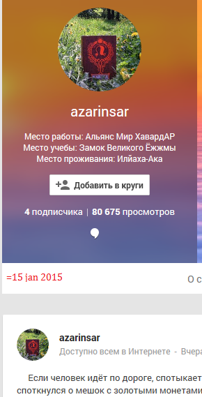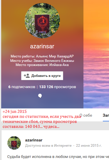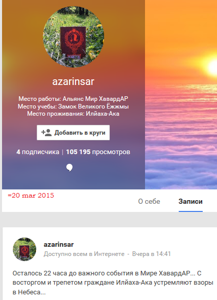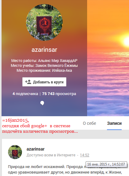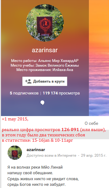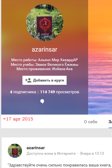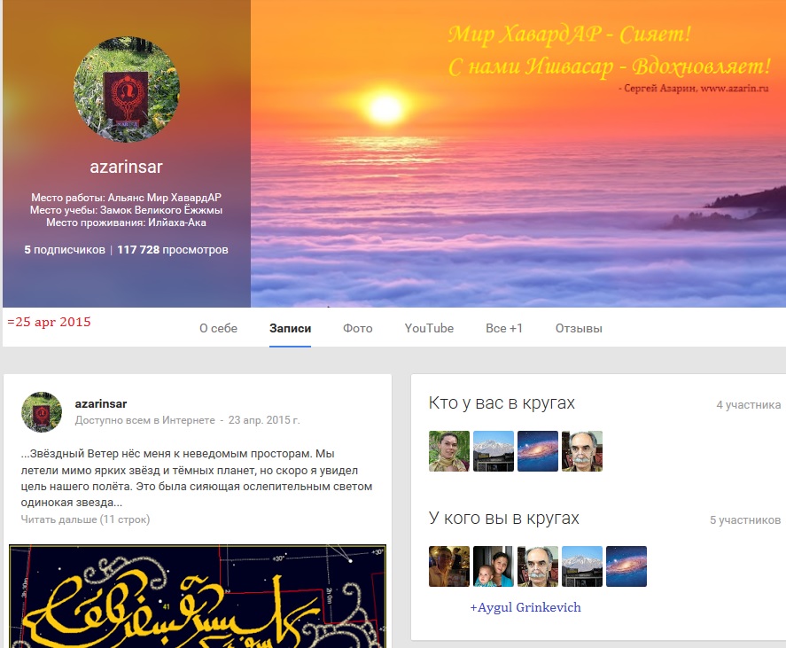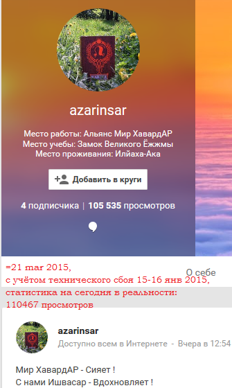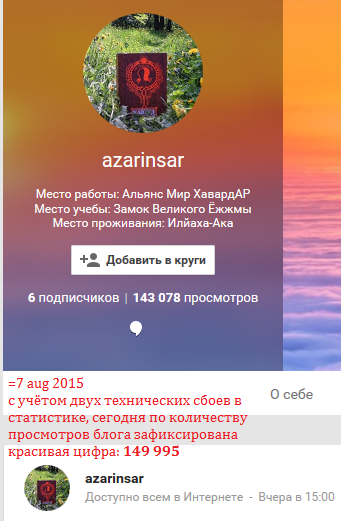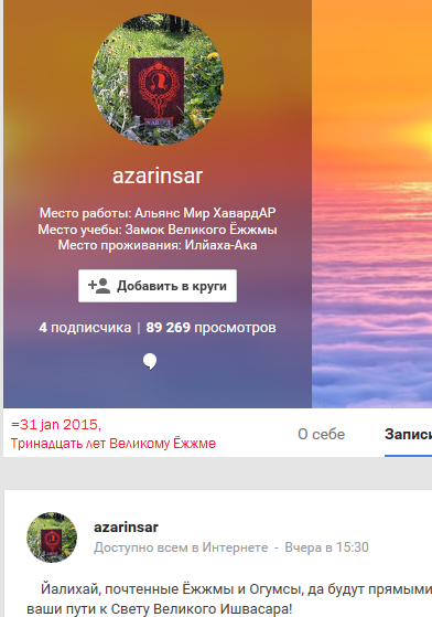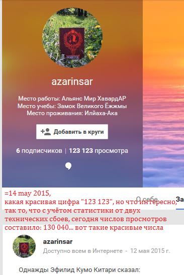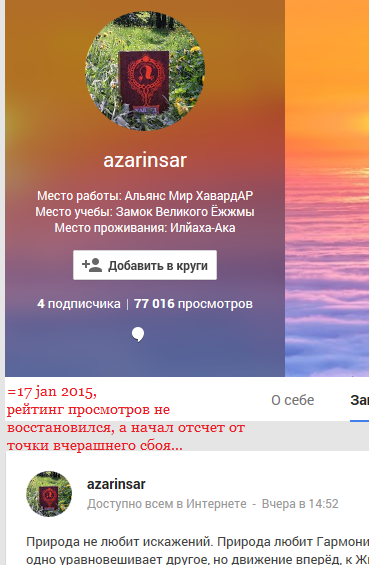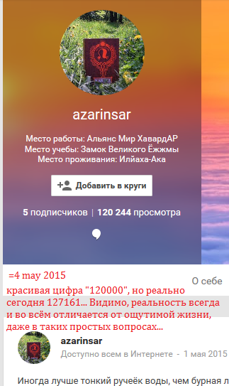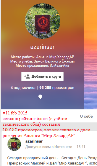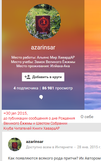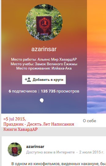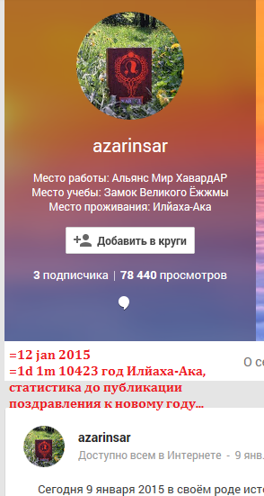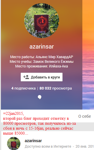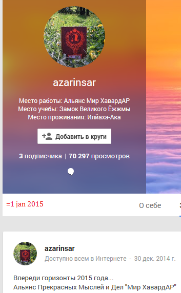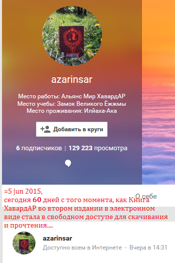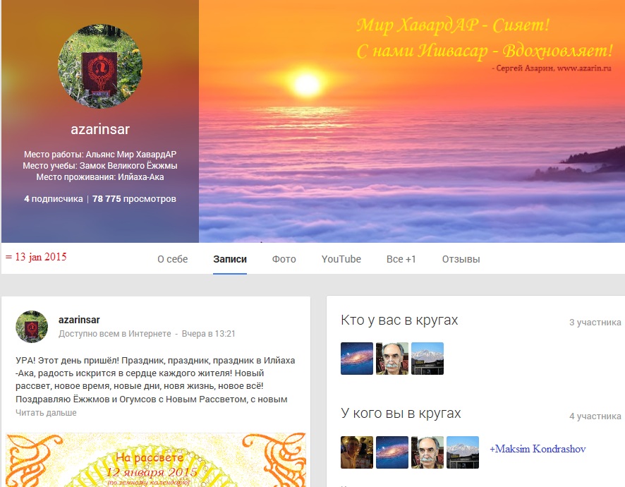 Начался новый творческий период. Прошедший год показал, что всё, что публикую в своём блоге, - вызывает достаточно высокий интерес. А публикую я фрагменты из Книги ХавардАР, из Книги Слов и Дней, из Книги Под Светом Ишвасара, ещё новые афоризмы и размышления о событиях, коим являюсь свидетелем. И конечно же, каждый текст имеет графические сопровождение. Публикую рисунки собственного творения и фотографии с Книгой ХавардАР. Ведение блога лично мне интересно. Всё, что я делал в прошедшем году, было мне интересно и увлекательно. И, надеюсь, продолжу свой творческий поиск в 2015 году... |
