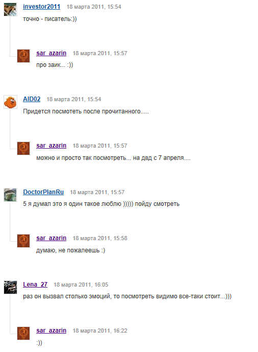 Да, разные бывают ситуации… Вот, например, 16 марта закрыл все позиции за три часа до окончания основной торговой сессии, выключил терминал, и поехал в путь далёкий, дабы на ночном сеансе насладиться просмотром нового кинофильма, выхода которого я ждал более полугода, причём, ориентировал свои ожидания только лишь на парочку случайно увиденных скупых кадров по общественному телевидению. Сразу скажу, в итоге я не пожалел, мои ожидания подтвердились, я безгранично доволен и буду смотреть ещё раз. На мой взгляд, это единственный достойный кинофильм изо всех новых, мной увиденных за последние пару лет, о котором я хочу сказать несколько слов. Перед просмотром прочитал несколько десятков комментариев к этому фильму, они не отличались оригинальностью. Таких комментаторов можно сравнить с человеком, который сел кушать арбуз, но ему подали яблоки, и после этого человек стал всем рассказывать, что арбузы слишком маленькие и зелёные внутри и не такие красные и сочные, как о них говорили в рекламе. Можно было бы посочувствовать этому человеку. Однако разбирая, что и как, выясняется, что этот человек перепутал рестораны, ибо зашёл в «Яблочную комнату», вместо того, чтобы посетить «Арбузный зал».