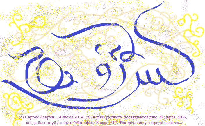 14 июня 2014 каллиграфия алфавитом Шеламху, на языке Илйаха-ака, так принято среди Эфилидов в клане Ёжжмов, этот рисунок есть посвящение выходу "Манифеста ХавардАР", чтобы связать два дня - 14 июня 2014 и 29 марта 2006, - ибо Время и История уже связали их в один узор...: