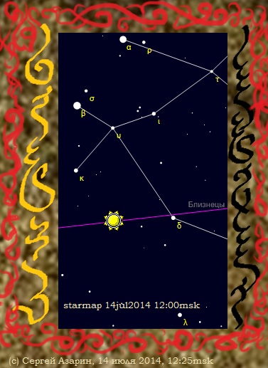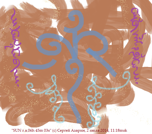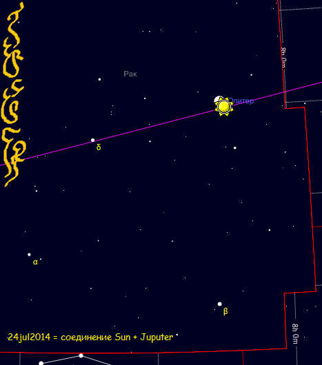 24 июля 2014 ...сегодня необычный день, в Небесах происходит соединение Солнца и Юпитера в созвездии Рак, не мог не отметить этот день своим рисунком с особым изображением, и зафиксировал карту неба, Асмерехешу - это слово Эфилидов, пояснения к рисунку будут опубликованы в моём блоге google+...: