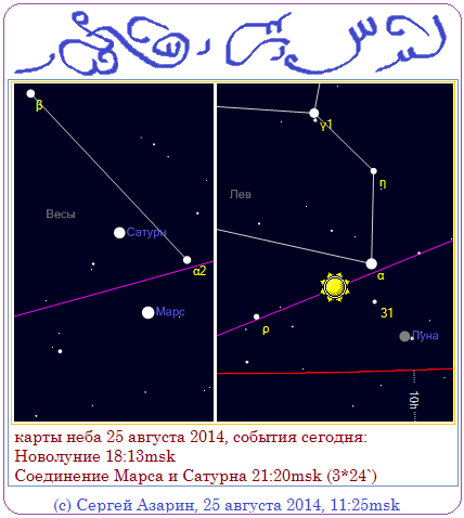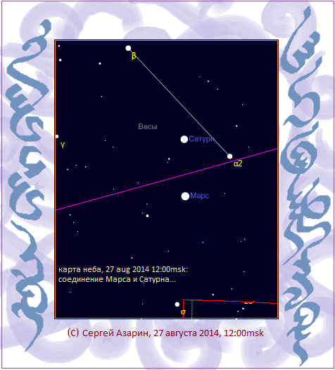 27 августа 2014 ...карта неба, зафиксировано соединение Марса и Сатурна в созвездии Весы...: