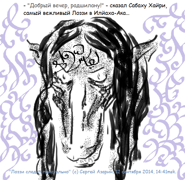 12 сентября 2014 ..."Лоззи следит пристально", решил сегодня расширить границы визуального восприятия мира Илйаха-Ака, нарисовал как примерно выглядят Лоззи, строчка вверху рисунка придумана в процессе работы, она не входит в Трилогию ХавардАР, рисунок опубликовал с соответствующими пояснениями в блоге google+...: