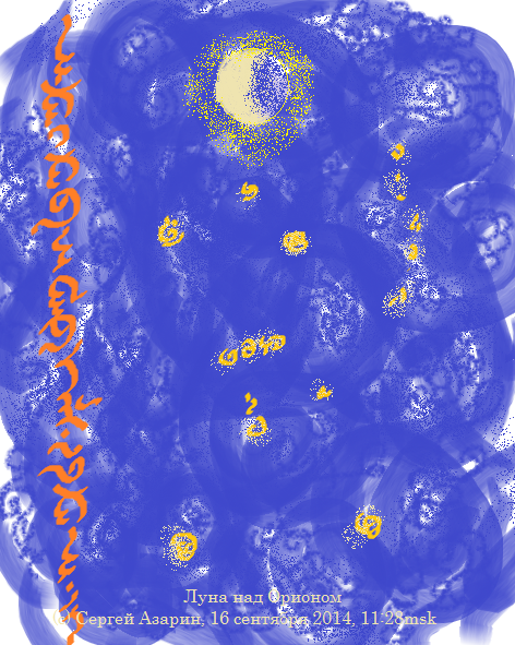 16 сентября 2014 ...большой день, три рисунка. День начался с того, что захотелось переложить свои ощущения от увиденного накануне ночью, сияние Луны над Орионом. Вторым рисунком отразил свои ощущения к событиям более масштабным. Ну и третий рисунок, уже под завершение дня, как бы итог, и само творение - на Пороге великих изменений...: