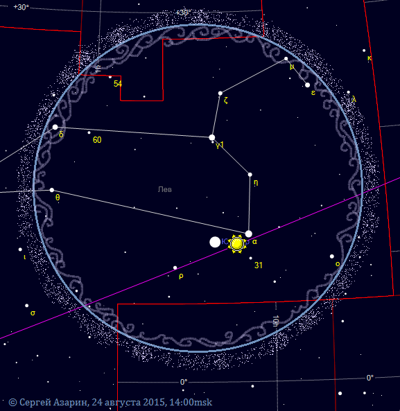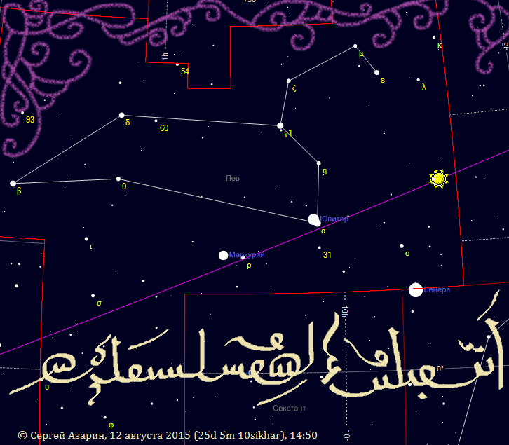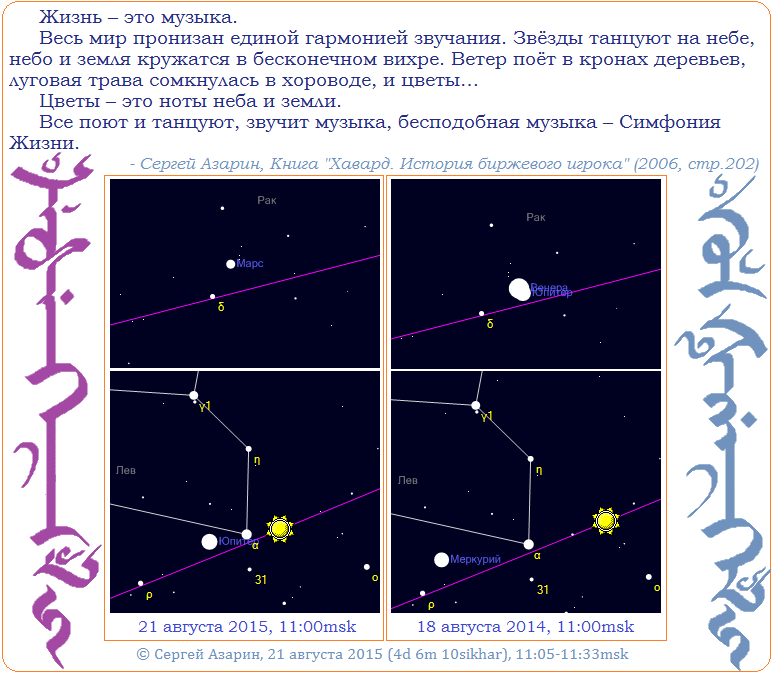 26 августа 2015 ...примерно через 11 часов состоится соединение Солнца и Юпитера в лучах альфа-звезды созвездия Лев... Интересное и красивое событие, в честь такого события опубликовал изречение Феледа Бихтуйана Шайа, подробнее в блоге google+/azarinsar: