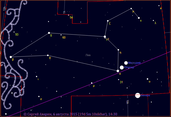 12 августа 2015 ...интересно, какие иной раз Фигуры рисуются в Космосе, Меркурий - Юпитер(+альфа-звезда Льва) - Солнце - Венера - Меркурий - настоящий треугольник, такое в жизни не каждому дано увидеть, да ещё и в таком положении, редкость, похожая на чудо. Рад быть свидетелем всех этих чудесных событий, подробнее в блоге google+/azarinsar:
