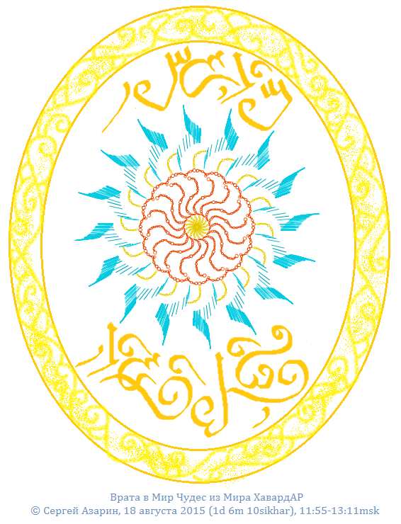 18 августа 2015 ...на рисунке каллиграфия (алфавитом Тзейсун, в стиле клана Мушаматов) в переводе означает: "Врата в Мир Чудес", опубликовал вместе с фрагментом из письма к читателю с небольшим комментарием: "Одно из чудес, что увидел на дорогах Мира ХавардАР, - это множество интересных собеседников, с которыми встречался то в лесу, то в таверне, то где-то в чистом поле, то на вершине горы... (и далее)", подробнее в блоге google+/azarinsar: