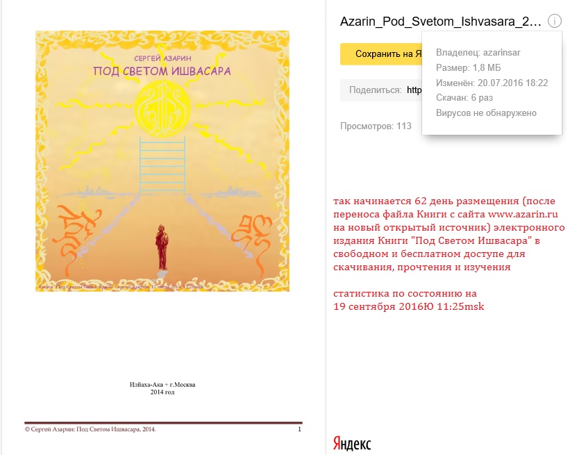 20 июля 2016 электронная Книга "Под Светом Ишвасара" (издание 2014 года) была перенесена с сайта www.azarin.ru на мой аккаунт на яндекс.диске. Книга находится в свободном и бесплатном доступе для скачивания, прочтения и изучения. Сегодня начался 62 день "эпохи переноса"... Фиксирую для истории статистику: