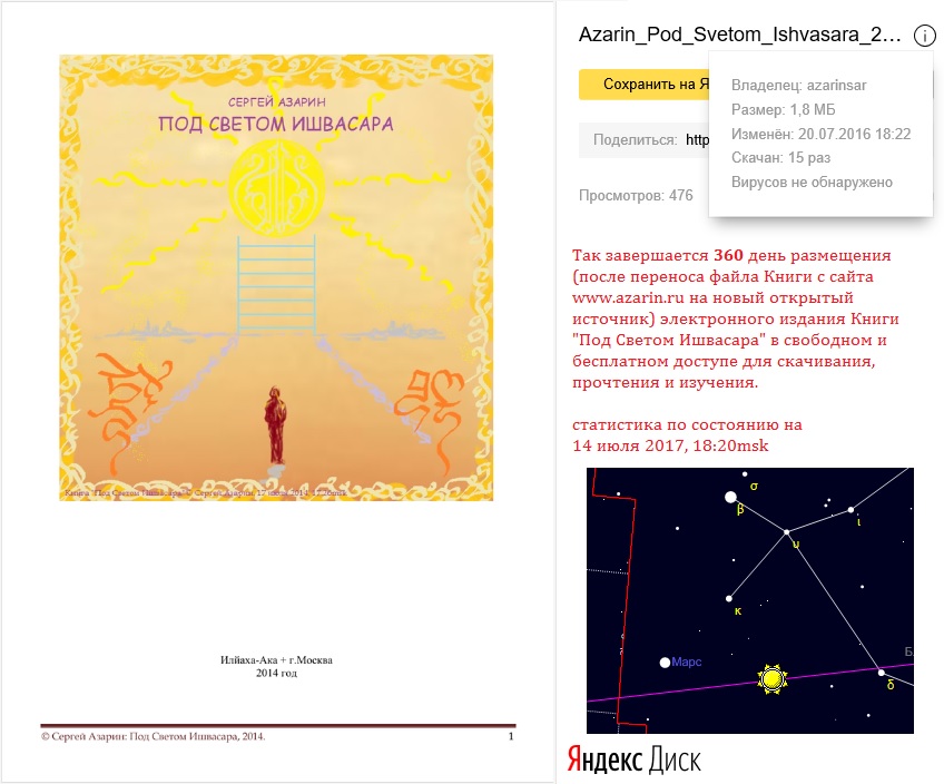 20 июля 2016 электронная Книга "Под Светом Ишвасара" (издание 2014 года) была перенесена с сайта www.azarin.ru на мой аккаунт на яндекс.диске. Так завершается 360 день размещения (после переноса файла Книги с сайта www.azarin.ru на новый открытый источник) электронного издания Книги "Под Светом Ишвасара" в свободном и бесплатном доступе для скачивания, прочтения и изучения. Фиксирую для истории статистику за этот период: