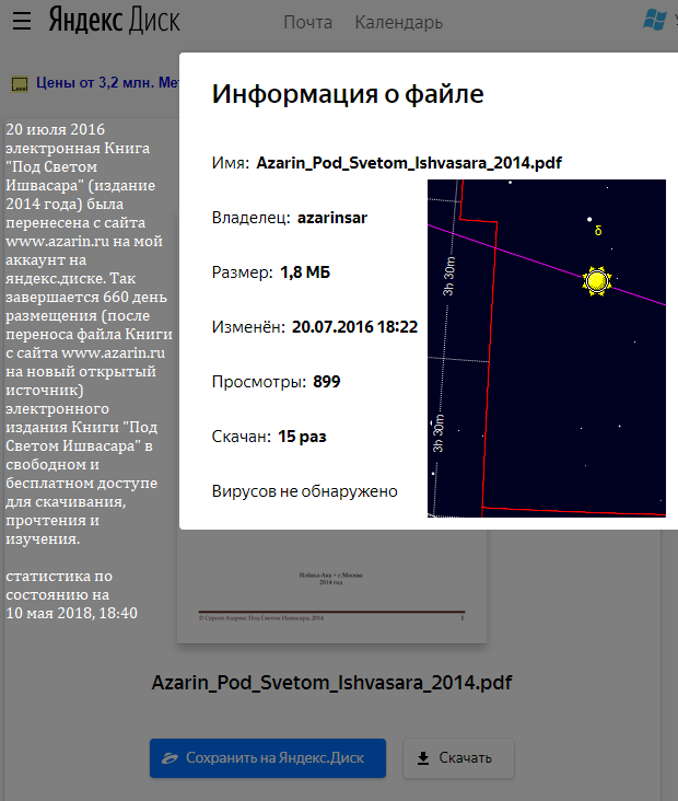 20 июля 2016 электронная Книга "Под Светом Ишвасара" (издание 2014 года) была перенесена с сайта www.azarin.ru на мой аккаунт на яндекс.диске. Так завершается 660 день размещения (после переноса файла Книги с сайта www.azarin.ru на новый открытый источник) электронного издания Книги "Под Светом Ишвасара" в свободном и бесплатном доступе для скачивания, прочтения и изучения. Фиксирую для истории статистику за этот период: